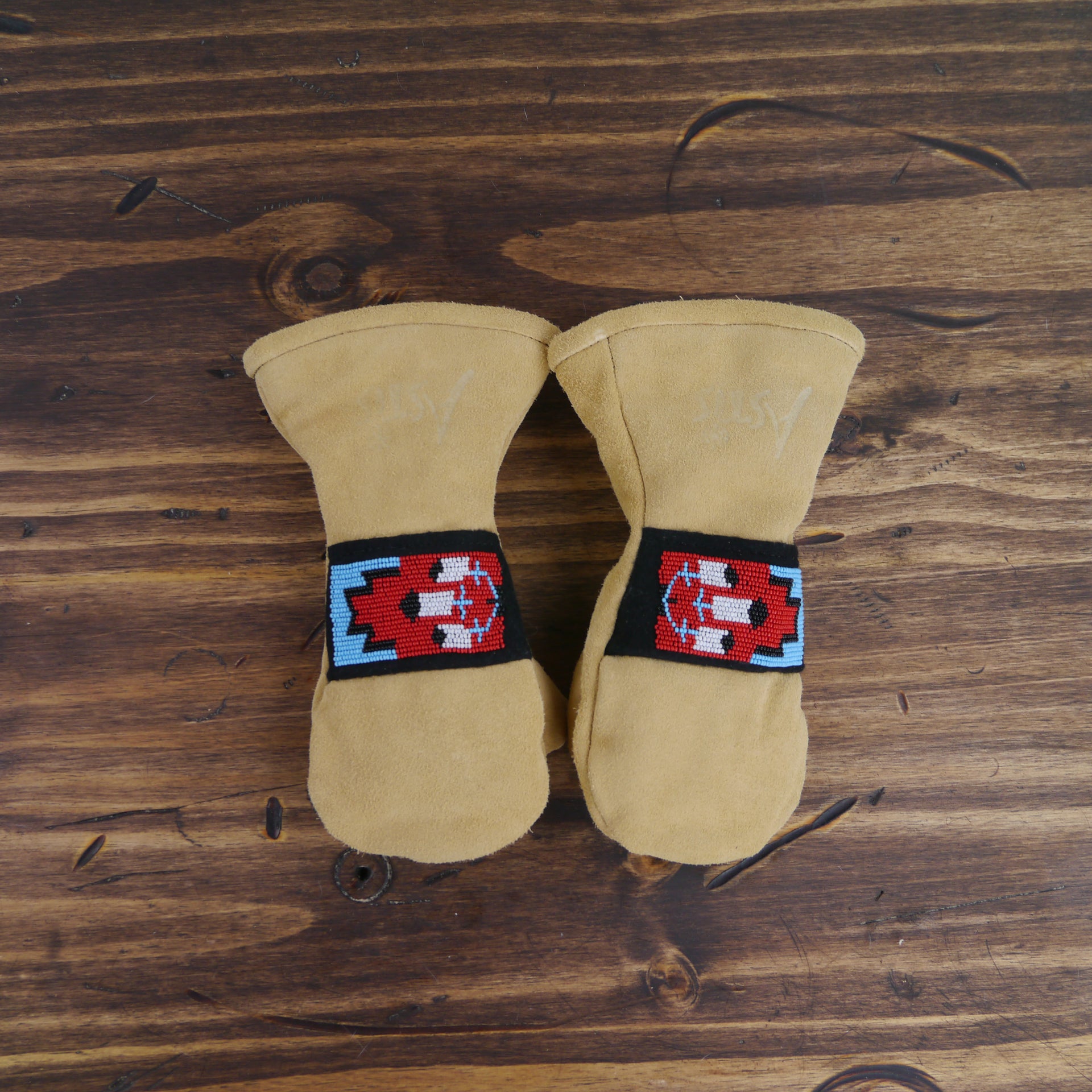 Astis leather mittens are hand-sewn in the USA from tan high-quality suede leather with hand-stitched beadwork on the wrist and are lined with Polartec® High Loft insulation. Working directly with a tannery in the USA, we developed a suede leather, injected with silicone during the tanning process for further waterproofing, that is extremely durable yet retains great dexterity.
