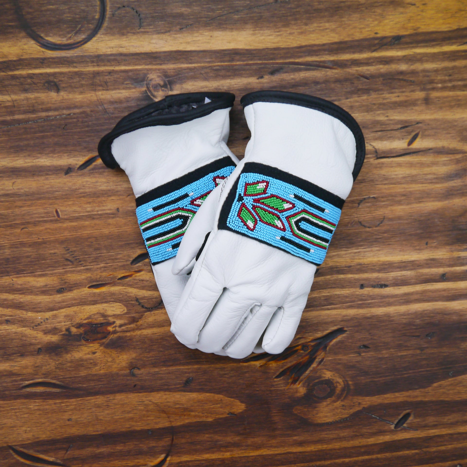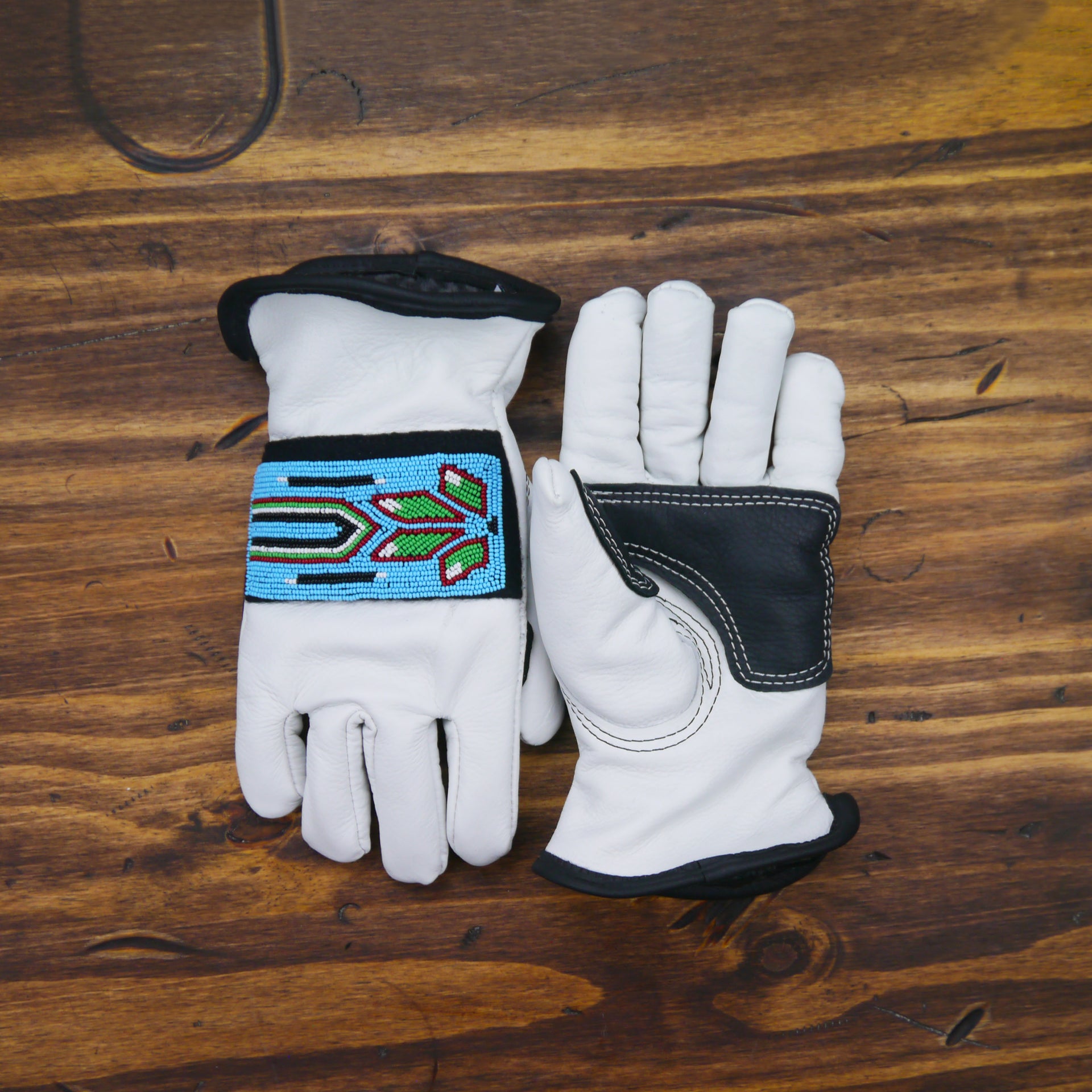 Displaying beadwork across the back of the hand, these white featherweight leather gloves are named for the Blue Jay.