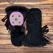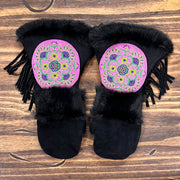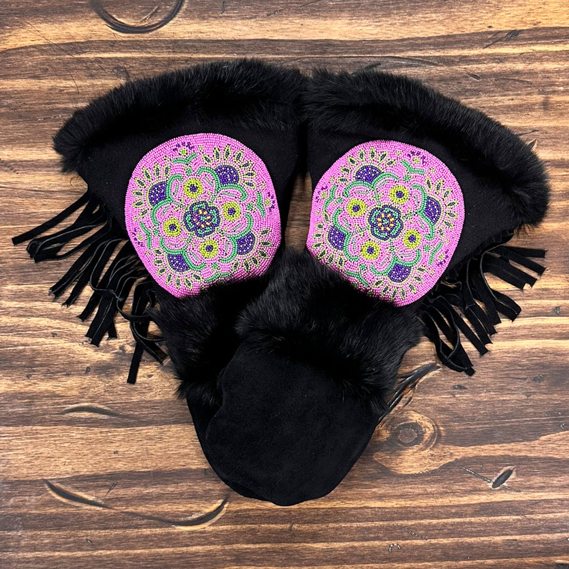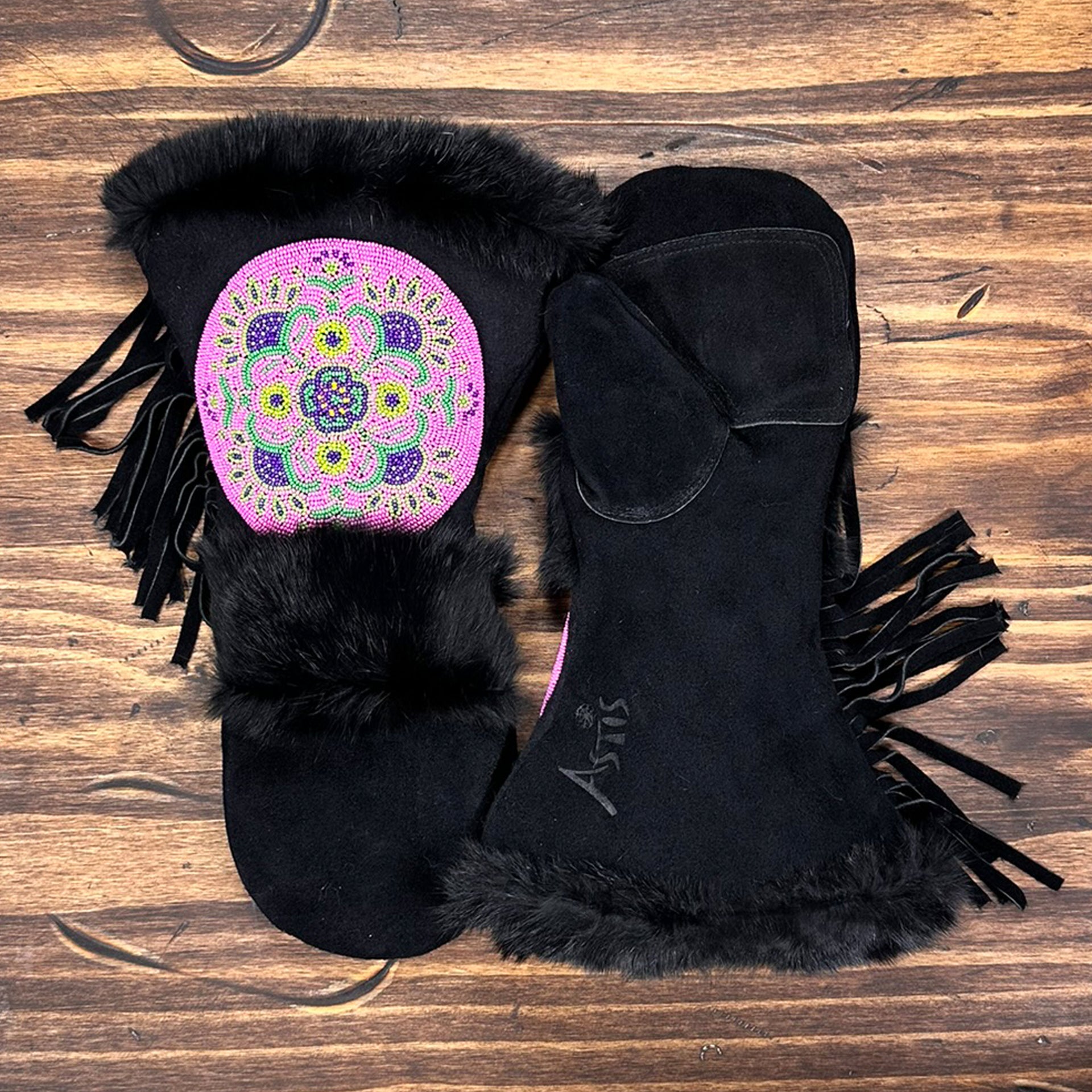 A comfortable, extremely warm mitten designed for any winter adventure, the Bonita is not only beautiful, but designed with function in mind. The gauntlet allows for a jacket sleeve to slip inside without bunching while the fur around the cuff creates a seal to help keep the snow on the outside. The thumb and palm patches are added to provide extra protection at common wear points. The beadwork is pretty good looking as well.
