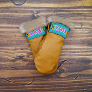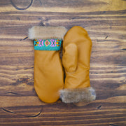 Displaying gorgeous beadwork across the back of the wrist, these acorn brown featherweight leather mittens are named for the Chestnut Sparrow.
