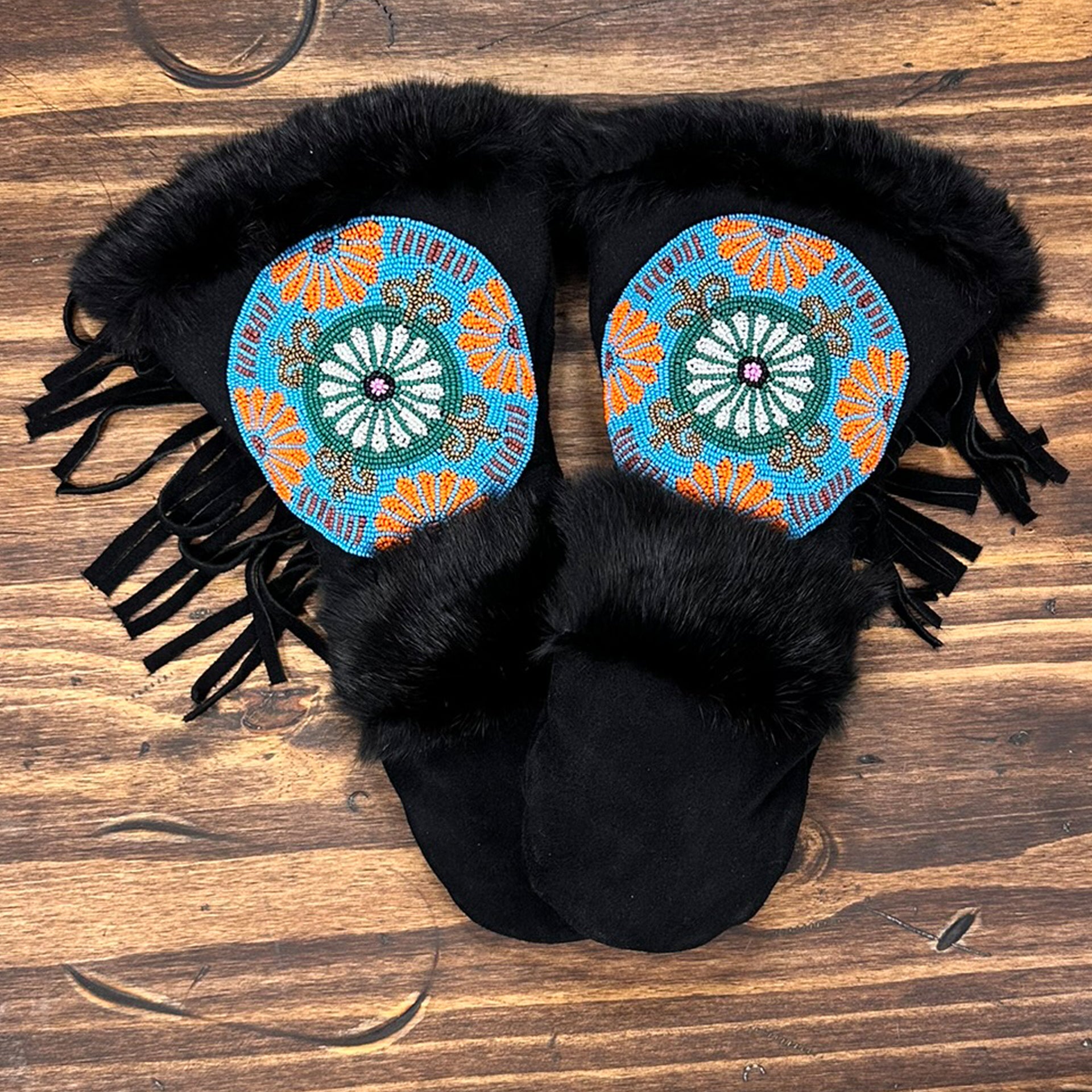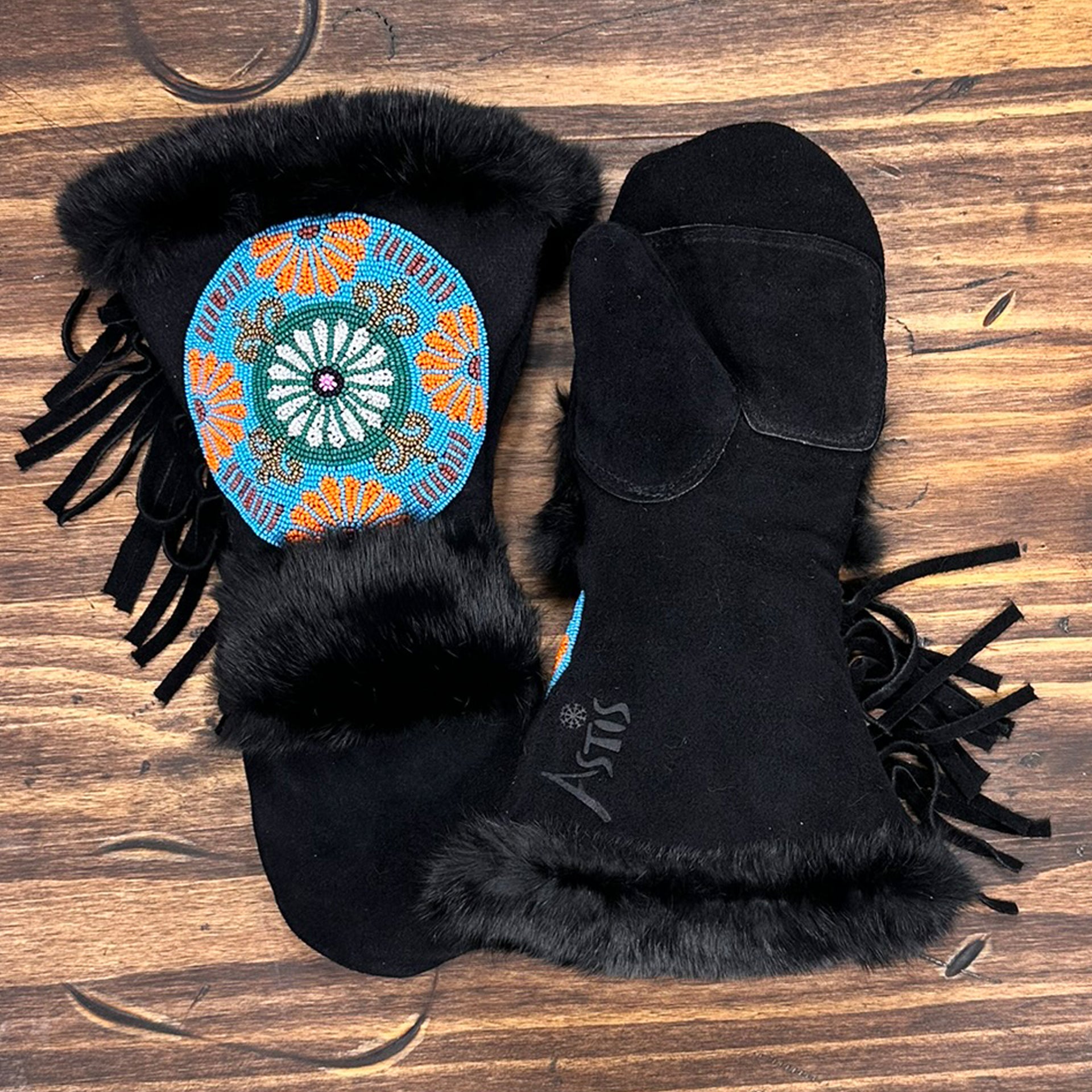 A comfortable, extremely warm mitten designed for any winter adventure, the Filion is not only beautiful, but designed with function in mind. The gauntlet allows for a jacket sleeve to slip inside without bunching while the fur around the cuff creates a seal to help keep the snow on the outside. The thumb and palm patches are added to provide extra protection at common wear points. The beadwork is pretty good looking as well.