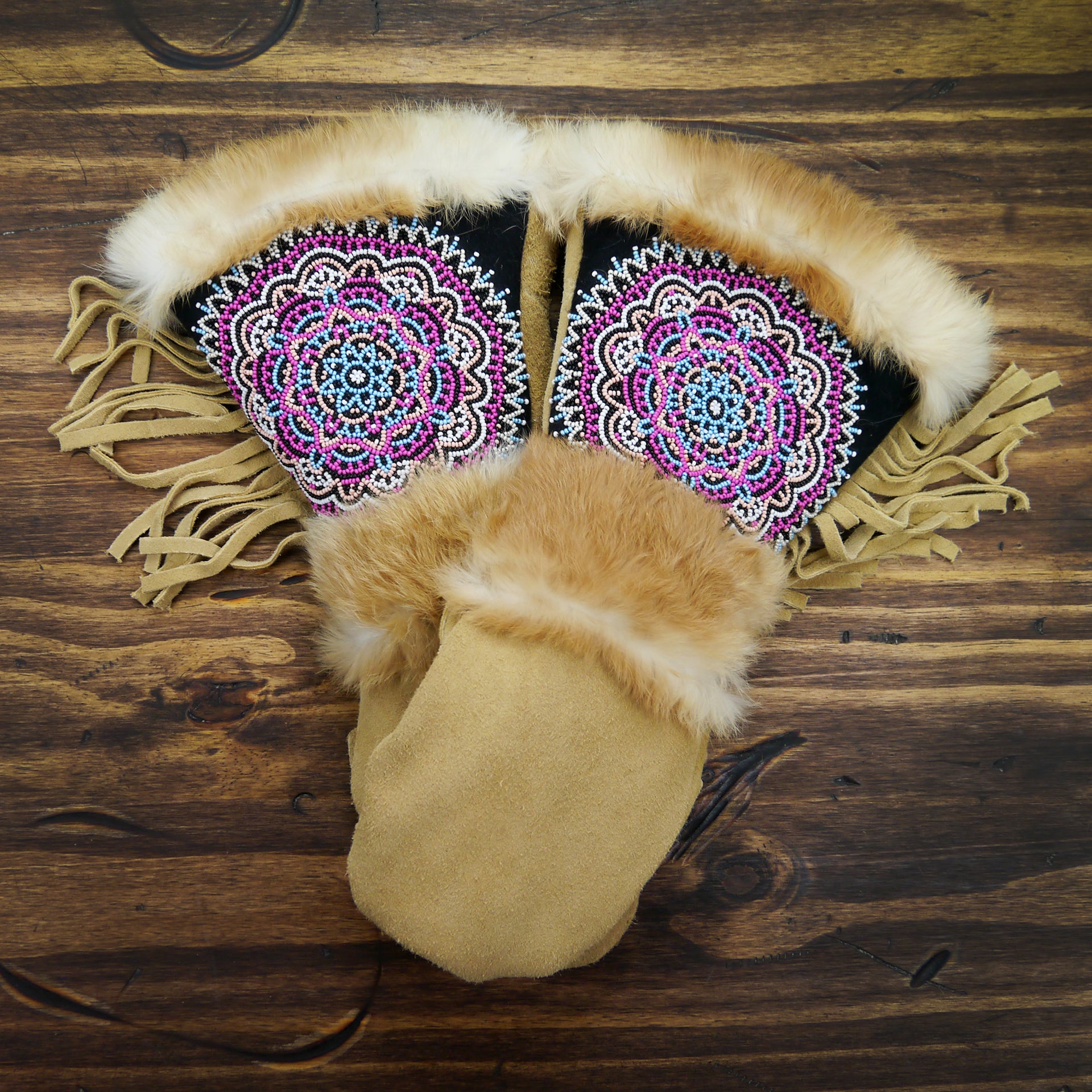A comfortable, extremely warm mitten designed for any winter adventure, the Hayden is not only beautiful, but designed with function in mind. The gauntlet allows for a jacket sleeve to slip inside without bunching while the fur around the cuff creates a seal to help keep the snow on the outside. The thumb and palm patches are added to provide extra protection at common wear points. The beadwork is pretty good looking as well.