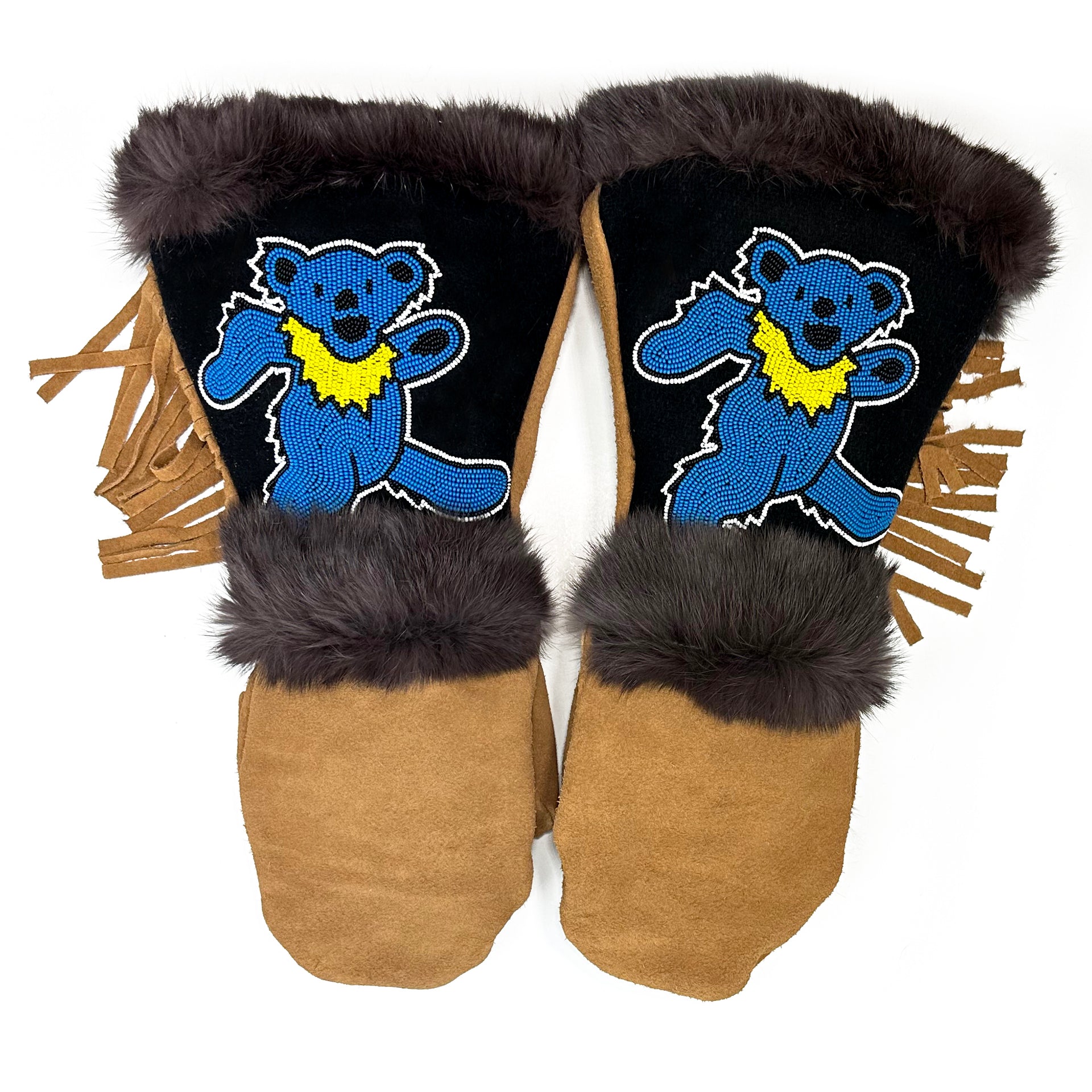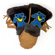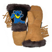 A comfortable, extremely warm mitten designed for any winter adventure, the Limited Co-Lab: Grateful Dead Blue Dancing Bear is not only beautiful, but designed with function in mind. The gauntlet allows for a jacket sleeve to slip inside without bunching while the fur around the cuff creates a seal to help keep the snow on the outside. The thumb and palm patches are added to provide extra protection at common wear points. The beadwork is pretty good looking as well.