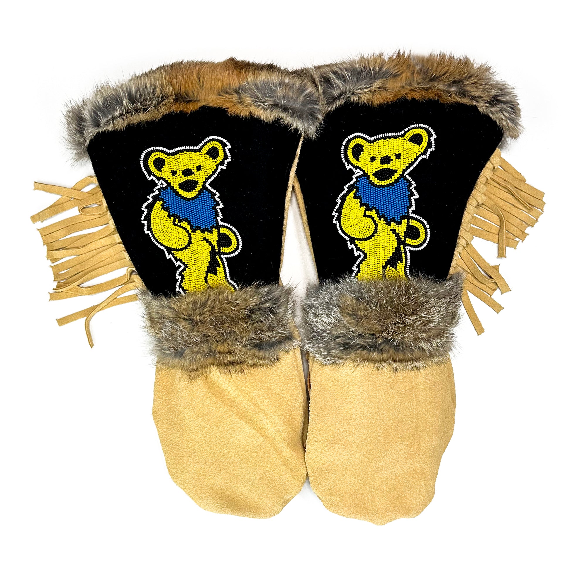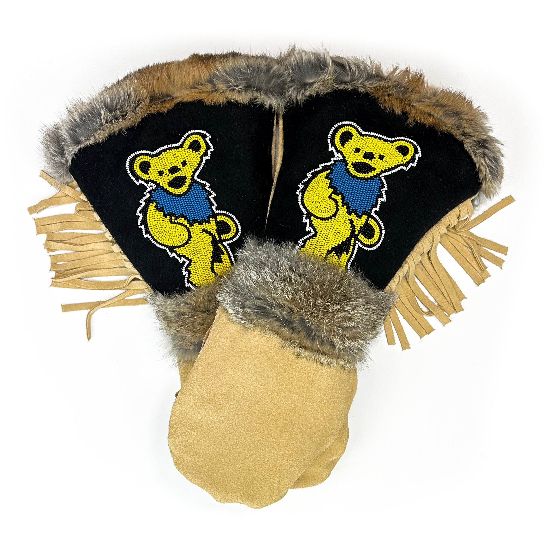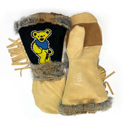 A comfortable, extremely warm mitten designed for any winter adventure, the Limited Co-Lab: Grateful Dead Yellow Dancing Bear is not only beautiful, but designed with function in mind. The gauntlet allows for a jacket sleeve to slip inside without bunching while the fur around the cuff creates a seal to help keep the snow on the outside. The thumb and palm patches are added to provide extra protection at common wear points. The beadwork is pretty good looking as well.