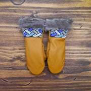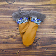 Displaying gorgeous beadwork across the back of the wrist, these acorn brown featherweight leather mittens are named for the Mourning Dove.