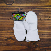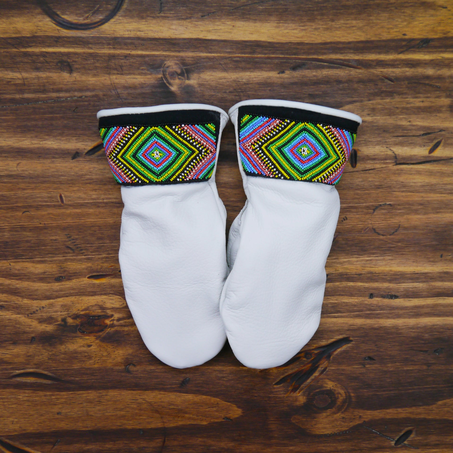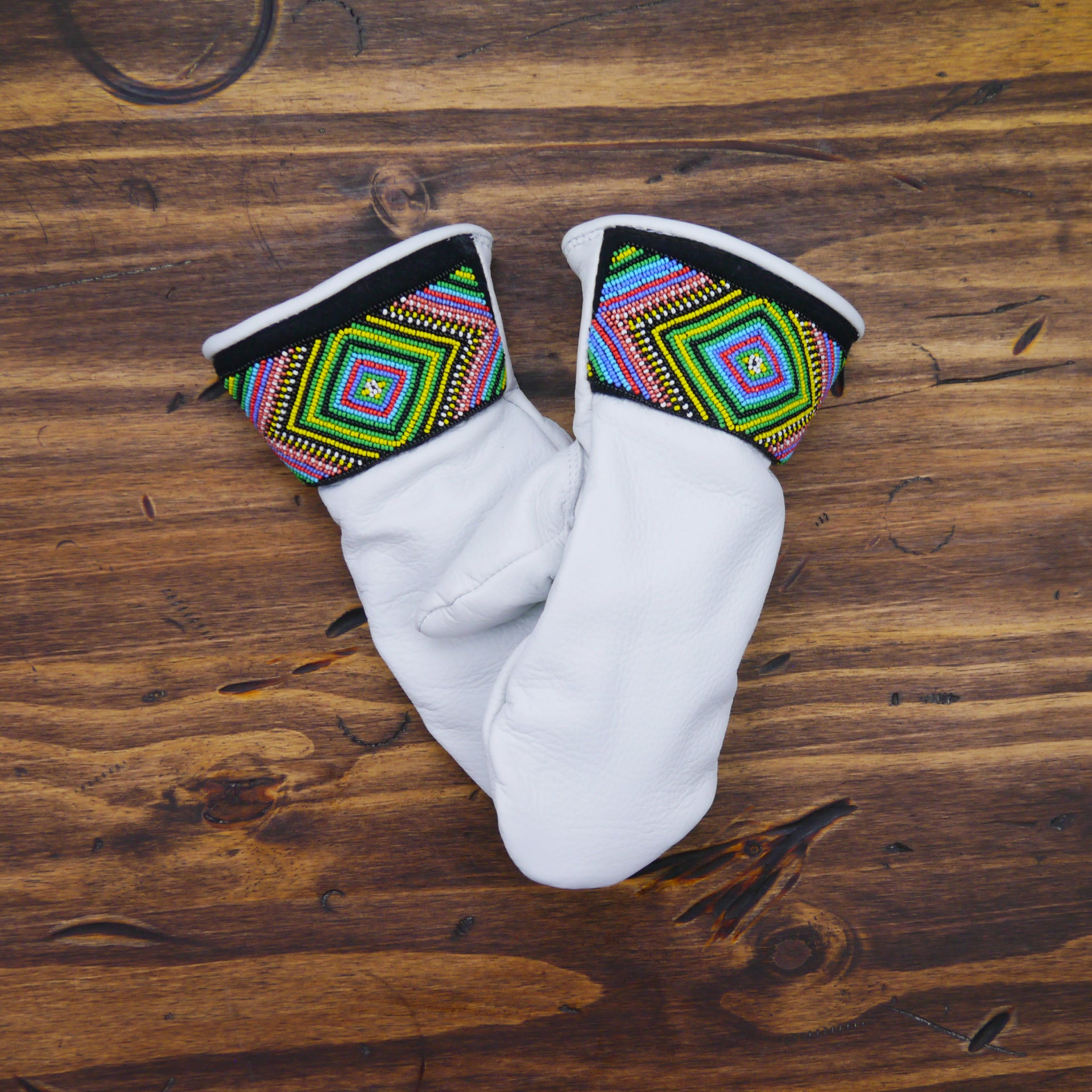 Displaying gorgeous beadwork across the back of the wrist, these white featherweight leather mittens are named for the Papuan Lorikeet.
