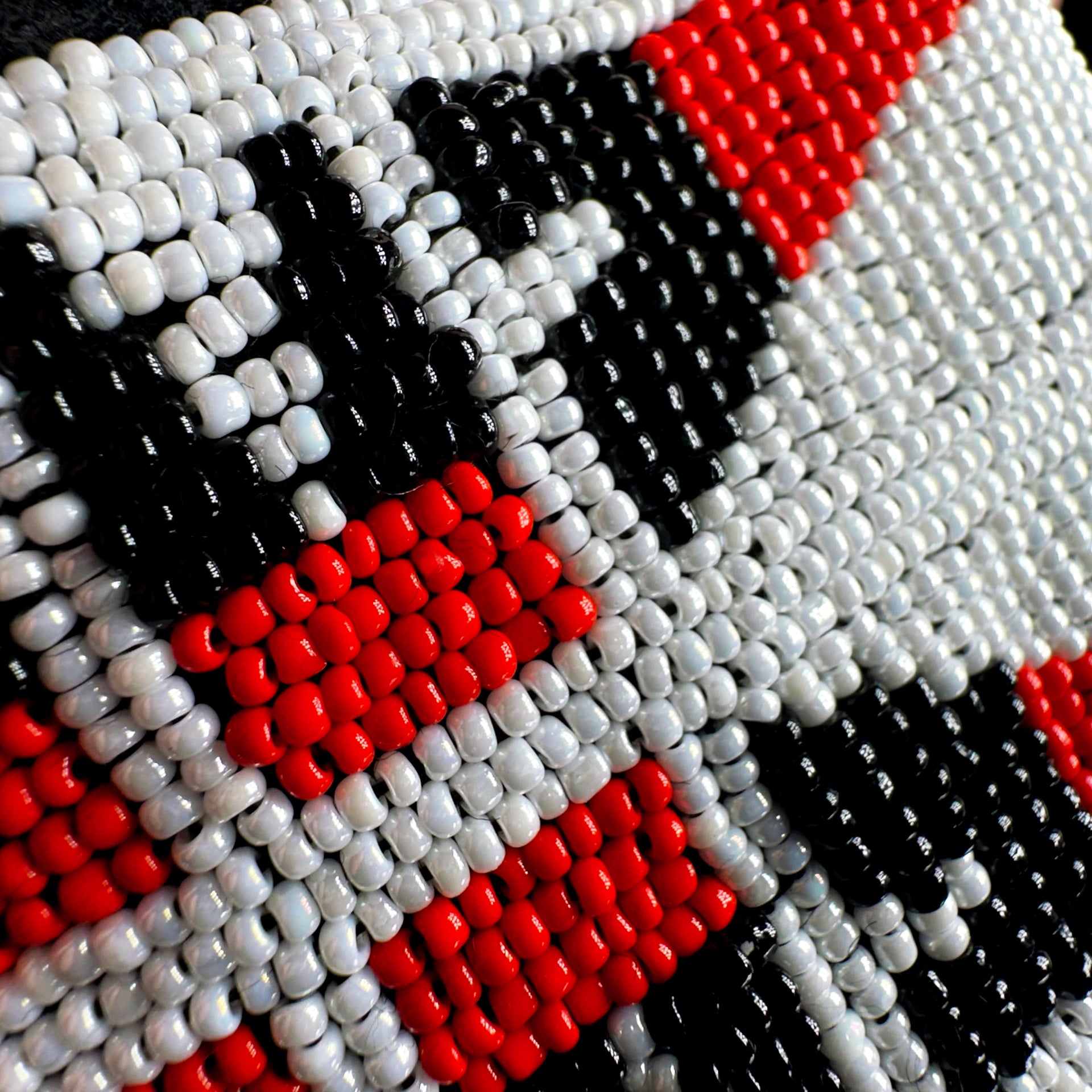 The name 'Sleeping Wolf' sets the tone for the design—a geometric masterpiece depicting a young wolf at rest. The design, a cherished emblem of the SoldierWolf family, unfolds in the traditional Arapaho colors of red, white, and black, adding a vibrant touch to the timeless narrative.