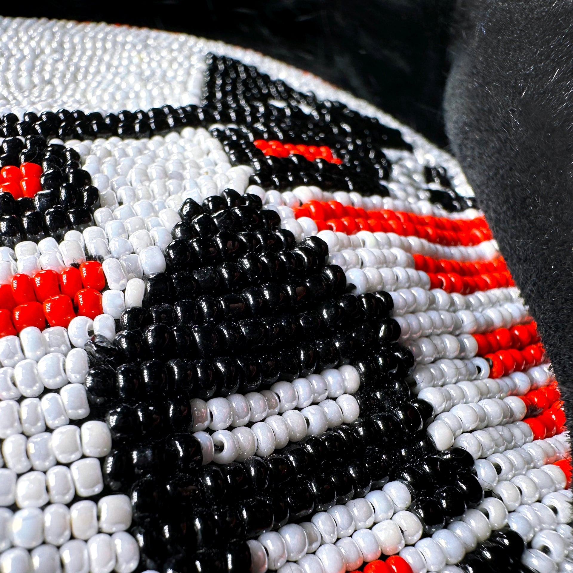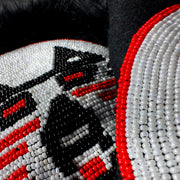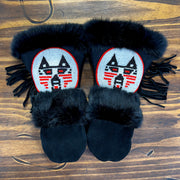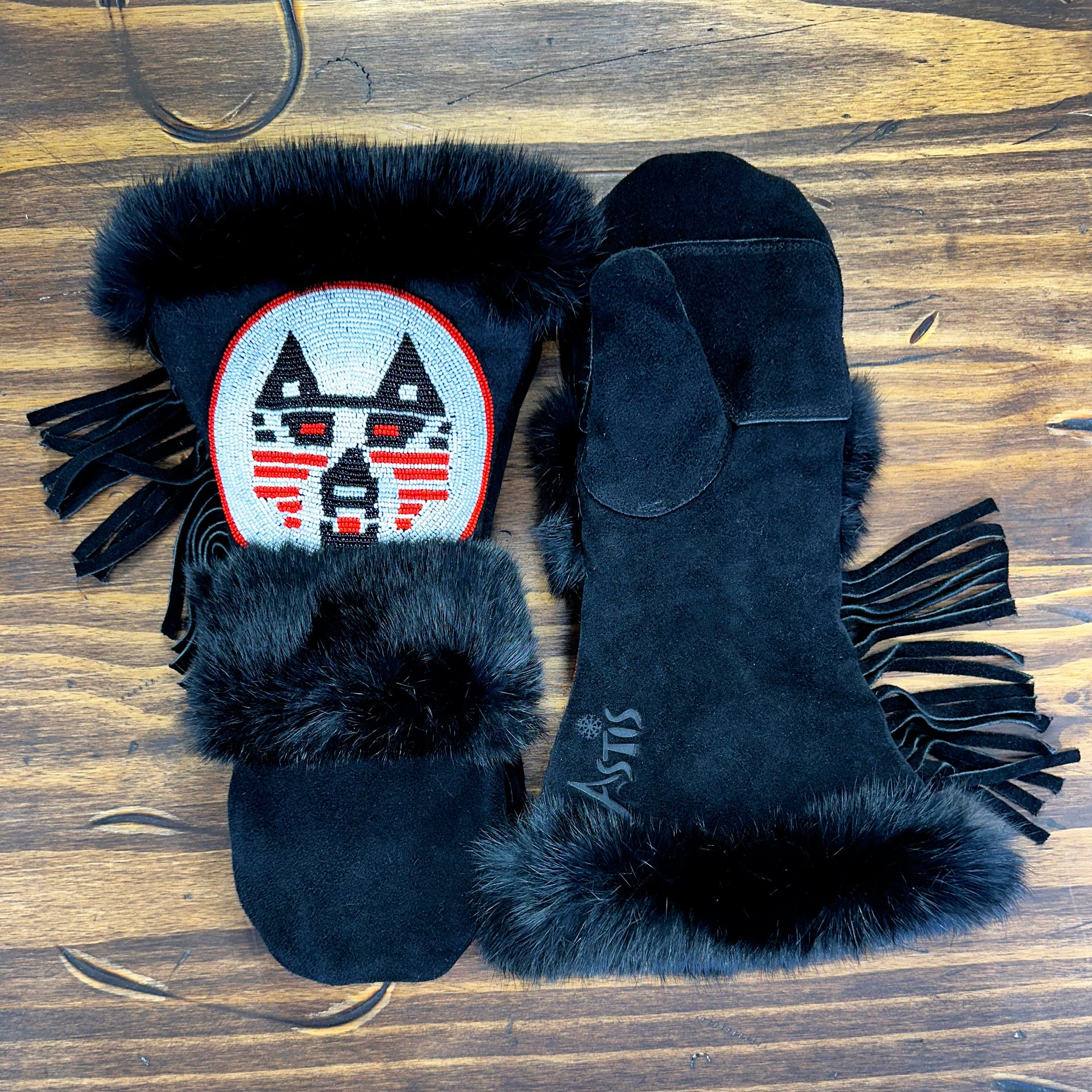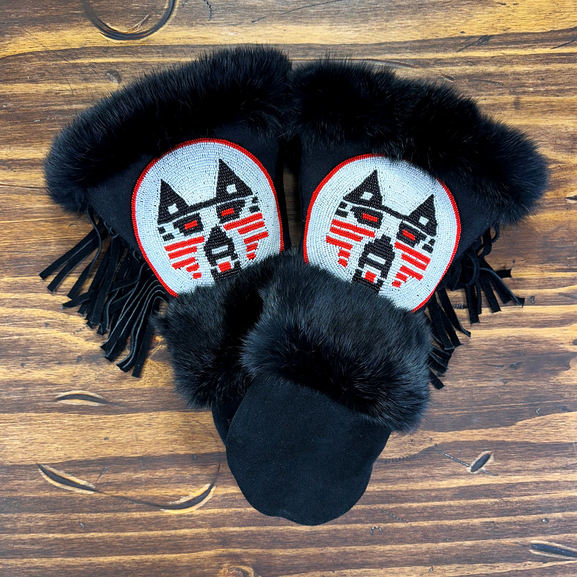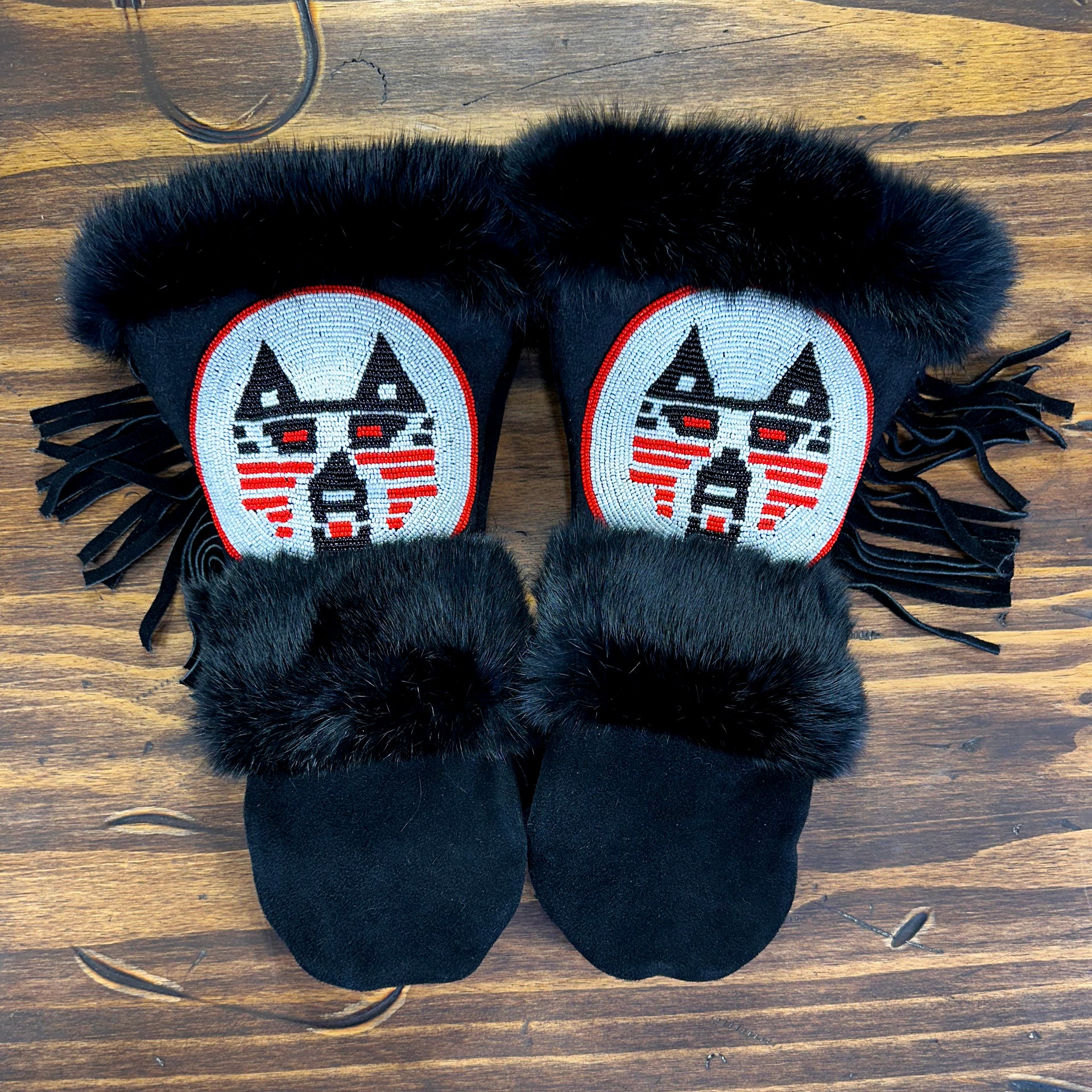 Fay Ann's artistry on these mittens unveils a geometric design—a depiction of a wolf from the esteemed SoldierWolf Family. Passed down through generations, this design carries the essence of familial connection, resilience, and a profound affinity for the land. The traditional Arapaho colors of red, white, and black bring vibrancy to the design, each hue holding its own significance in the cultural tapestry.