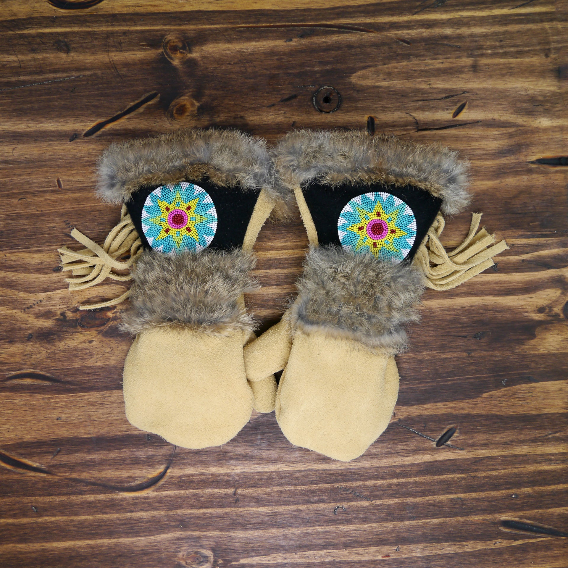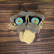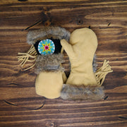 As each leather mitten is hand-sewn and uses natural materials, each leather mitten will possess slight variation in the look of the leather, beadwork, and fur trim. Astis embraces these subtle differences and views them as unique mittens more akin to works of art.