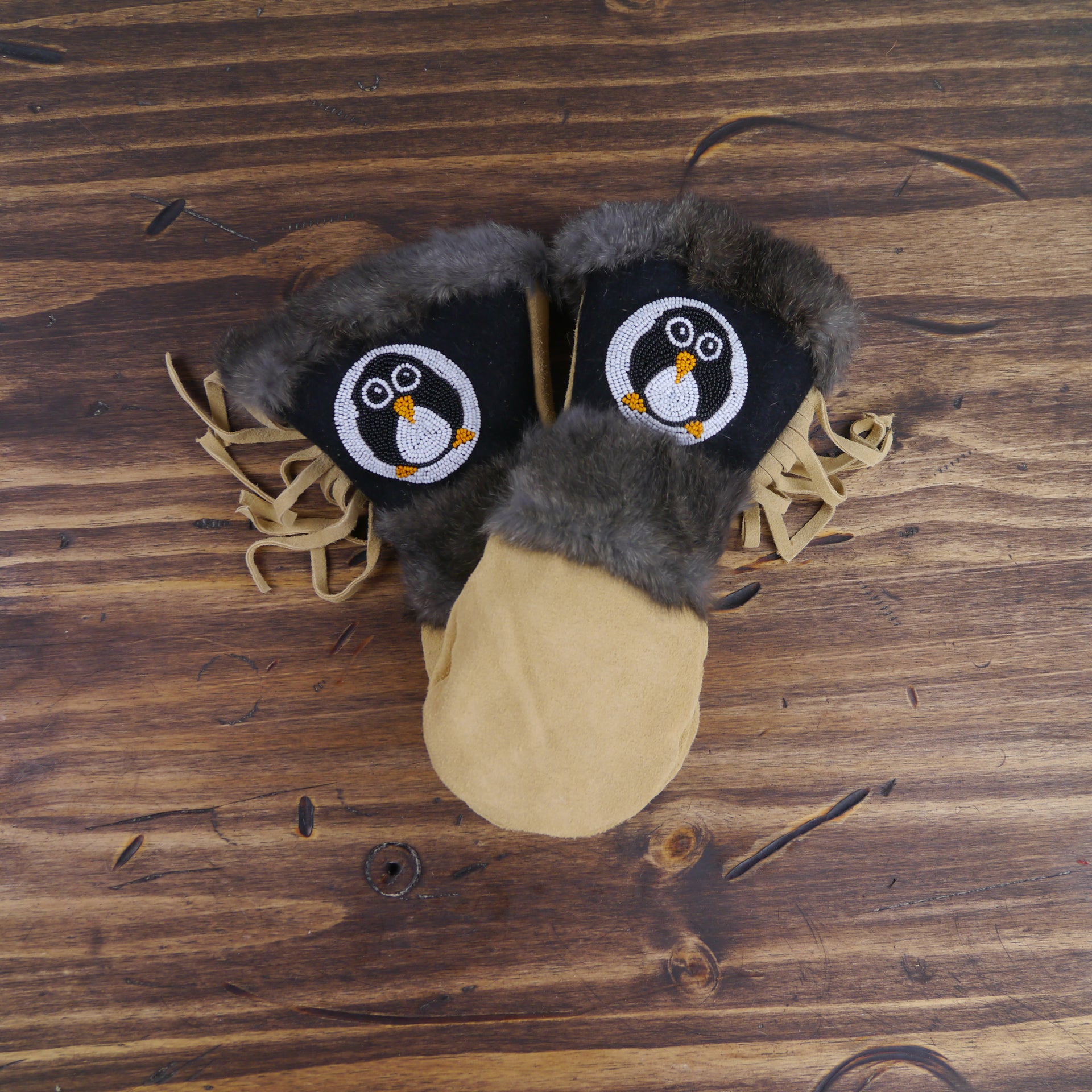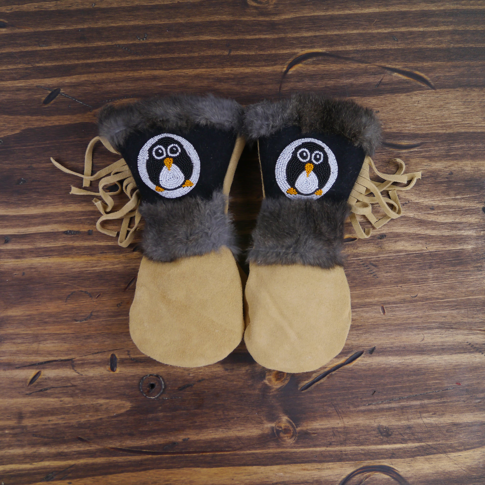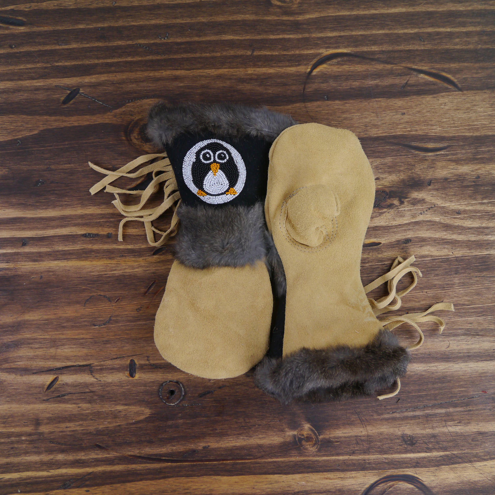 Displaying a cute penguin beadwork design on the gauntlet, these tan leather mittens are named for the Tenderfoot chair at Whitefish.