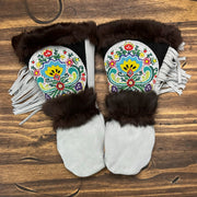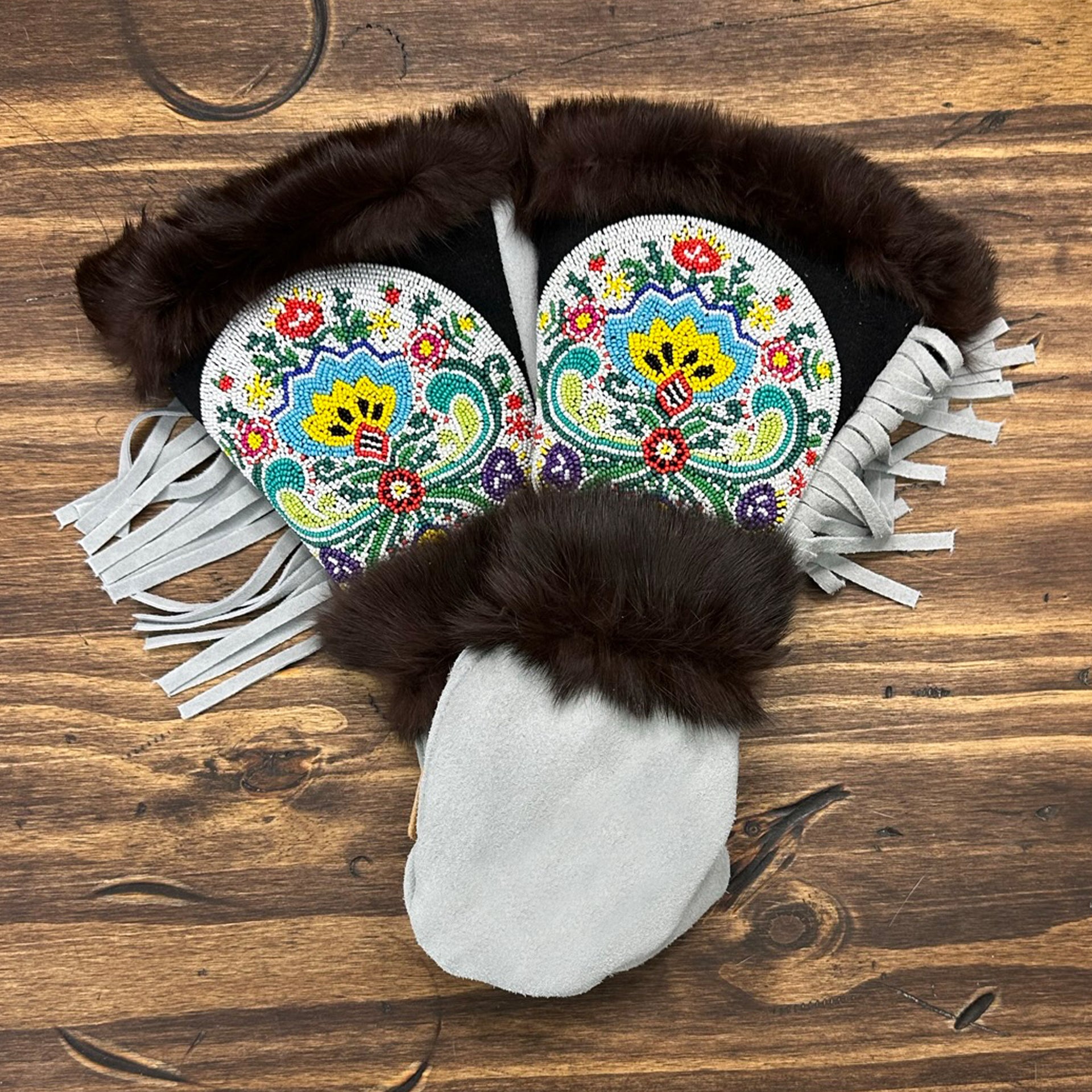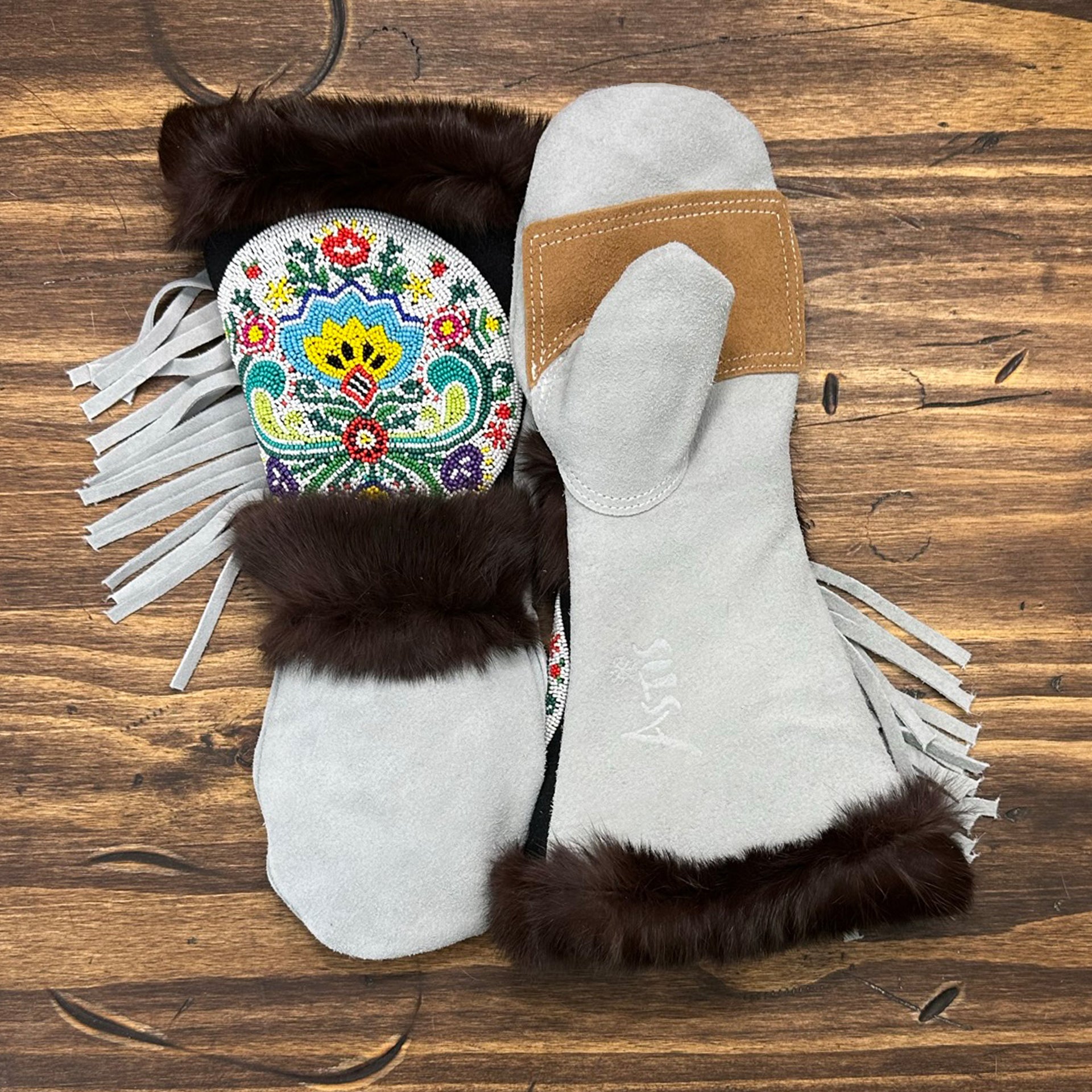 As each leather mitten is hand-sewn and uses natural materials, each leather mitten will possess slight variation in the look of the leather, beadwork, and fur trim. Astis embraces these subtle differences and views them as unique mittens more akin to works of art.