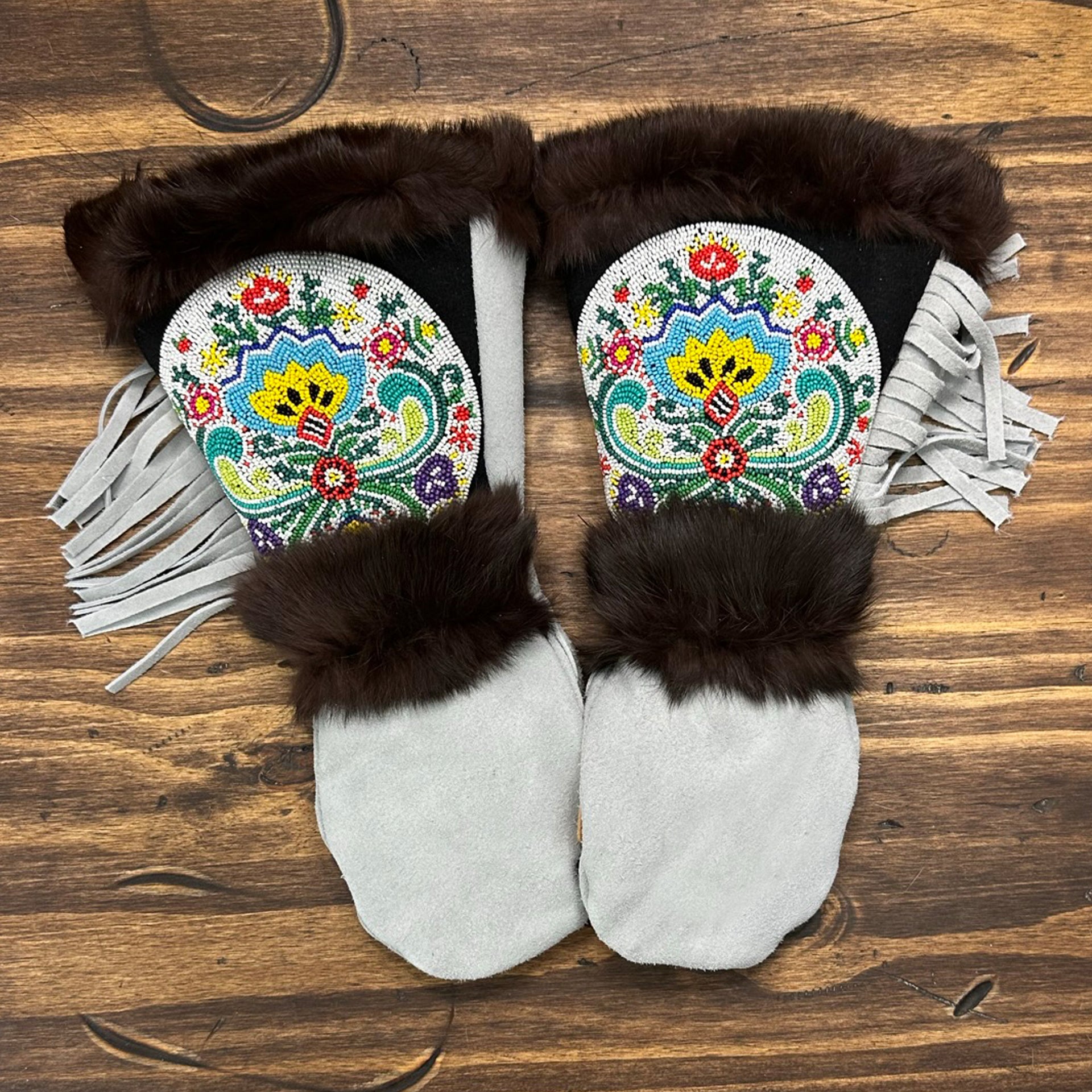 A comfortable, extremely warm mitten designed for any winter adventure, the Tittle is not only beautiful, but designed with function in mind. The gauntlet allows for a jacket sleeve to slip inside without bunching while the fur around the cuff creates a seal to help keep the snow on the outside. The thumb and palm patches are added to provide extra protection at common wear points. The beadwork is pretty good looking as well.