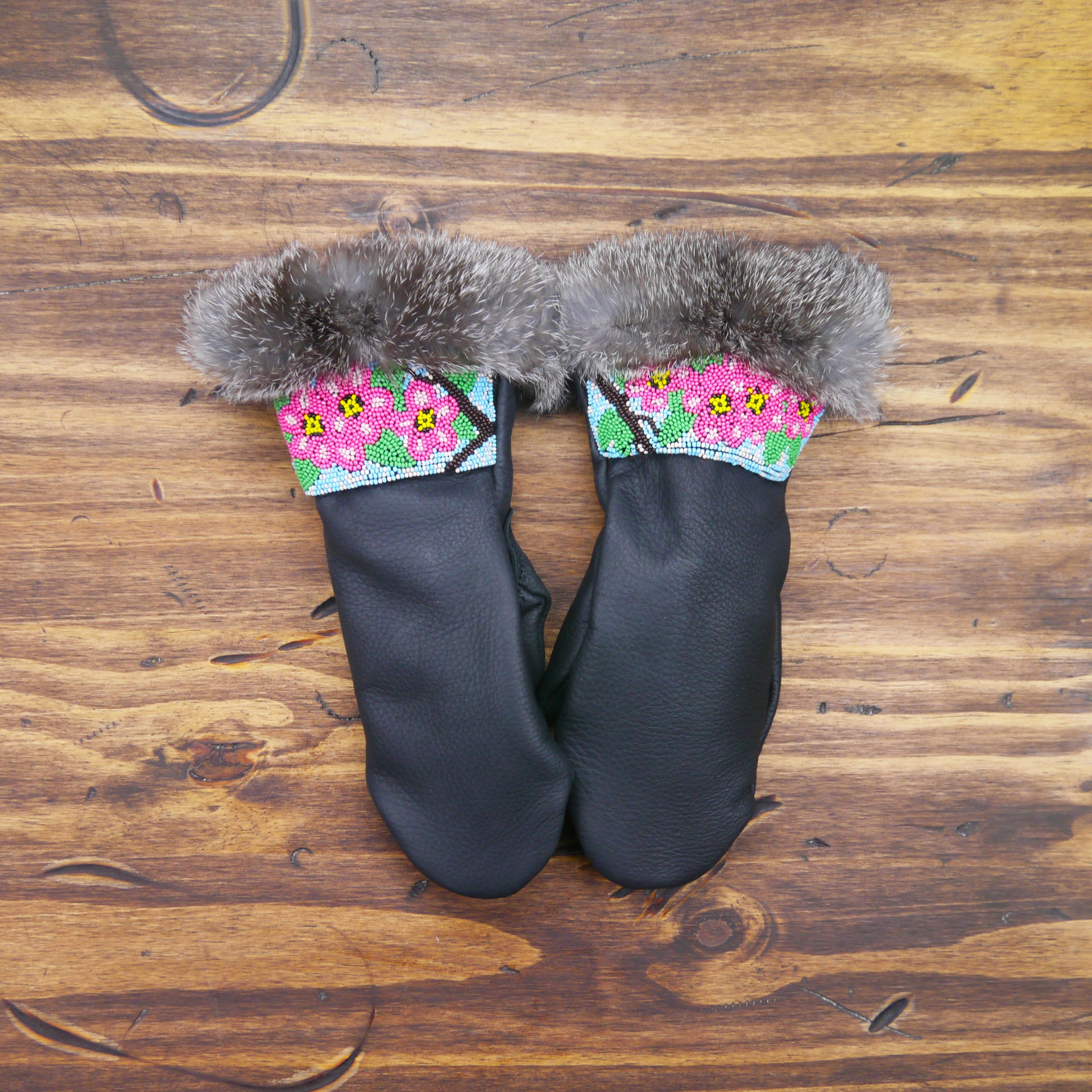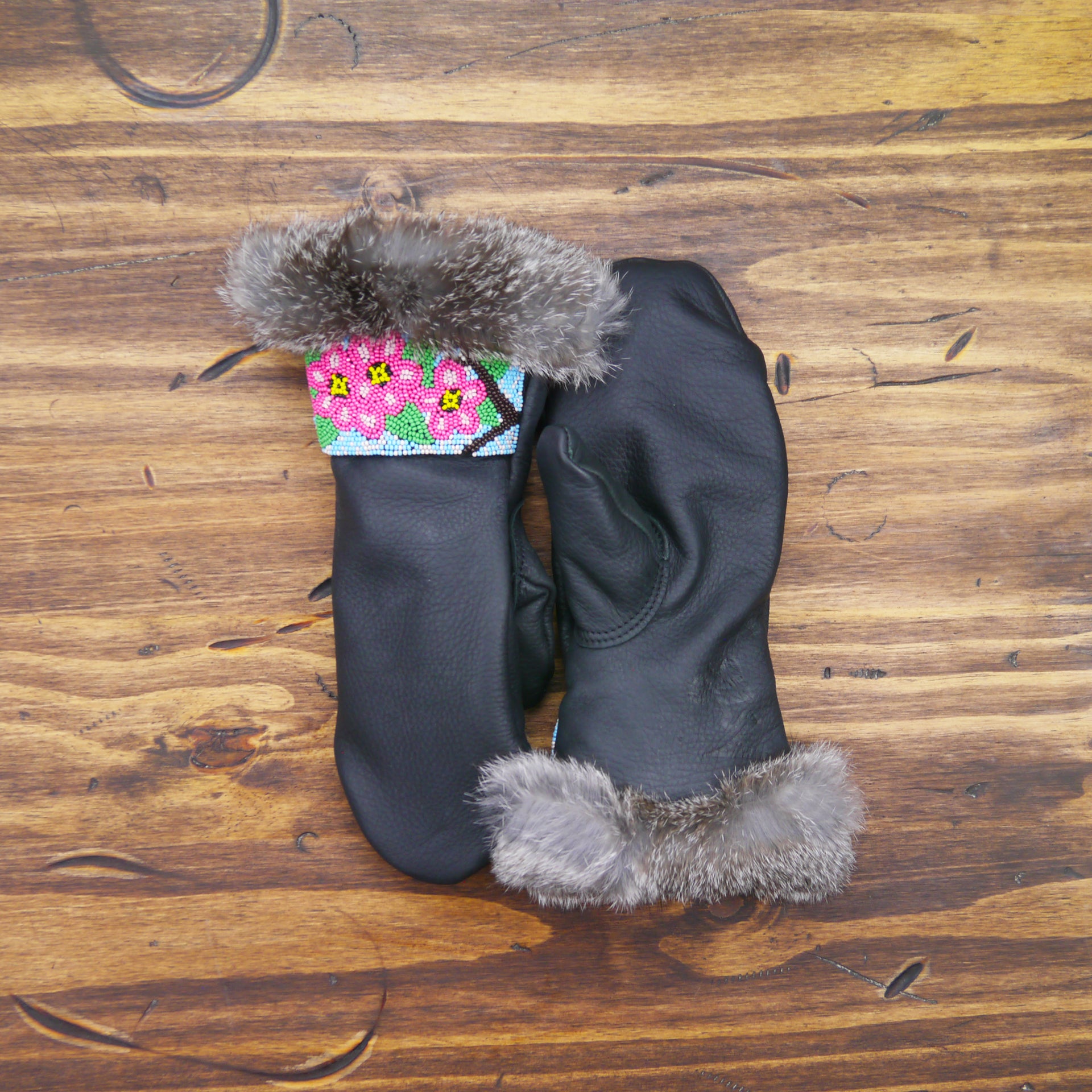 Displaying gorgeous beadwork across the back of the wrist, these black featherweight leather mittens are named for the Tufted Duck.