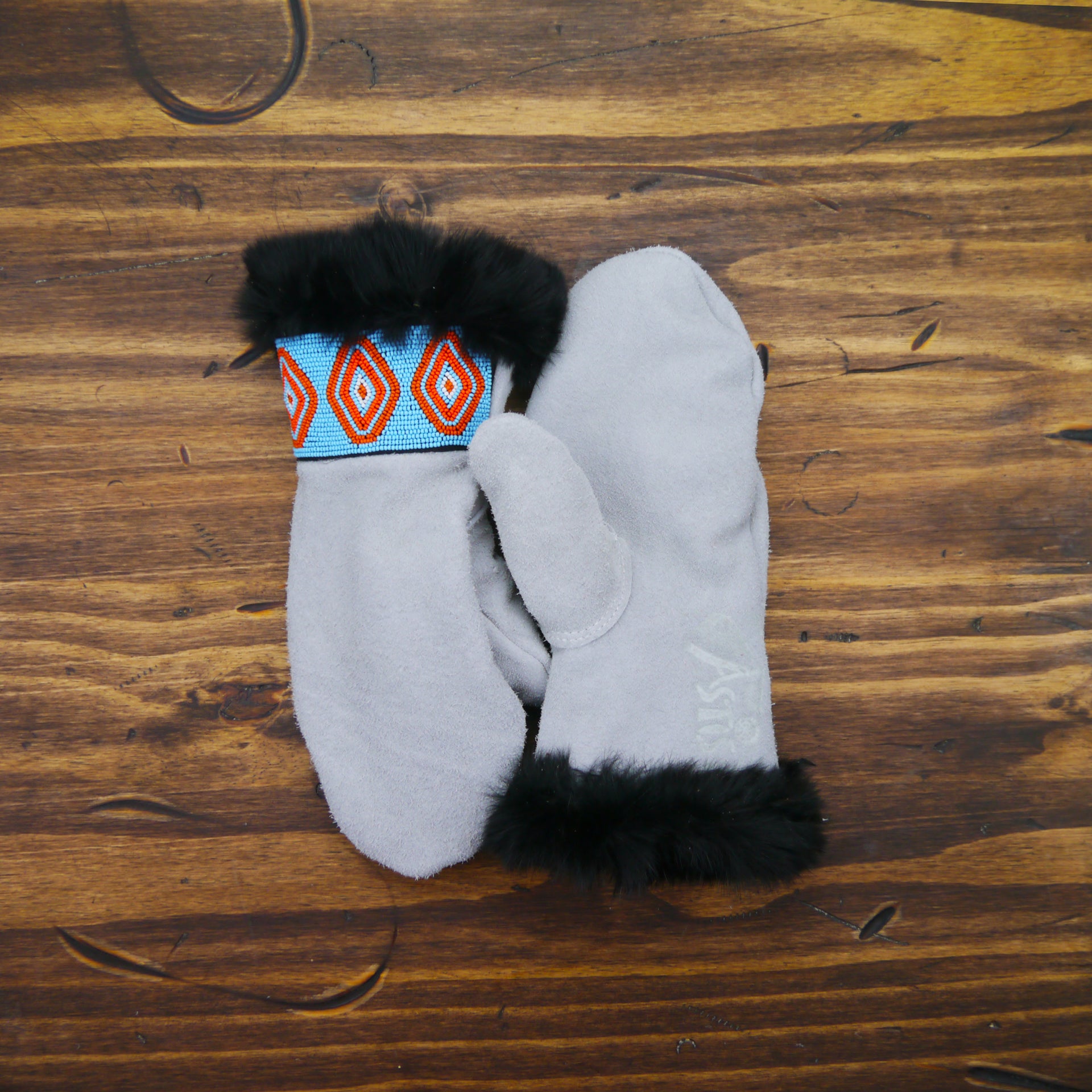 The Cleveland short-cuff mitten displays a beautiful beadwork design on top of the hand. They are hand-sewn in the USA from high-quality grey suede leather with hand-stitched beadwork on the back of the hand and are lined with Polartec® High Loft insulation. Working directly with a tannery in the USA, we developed a suede leather, injected with silicone during the tanning process for further waterproofing, that is extremely durable yet retains great dexterity.