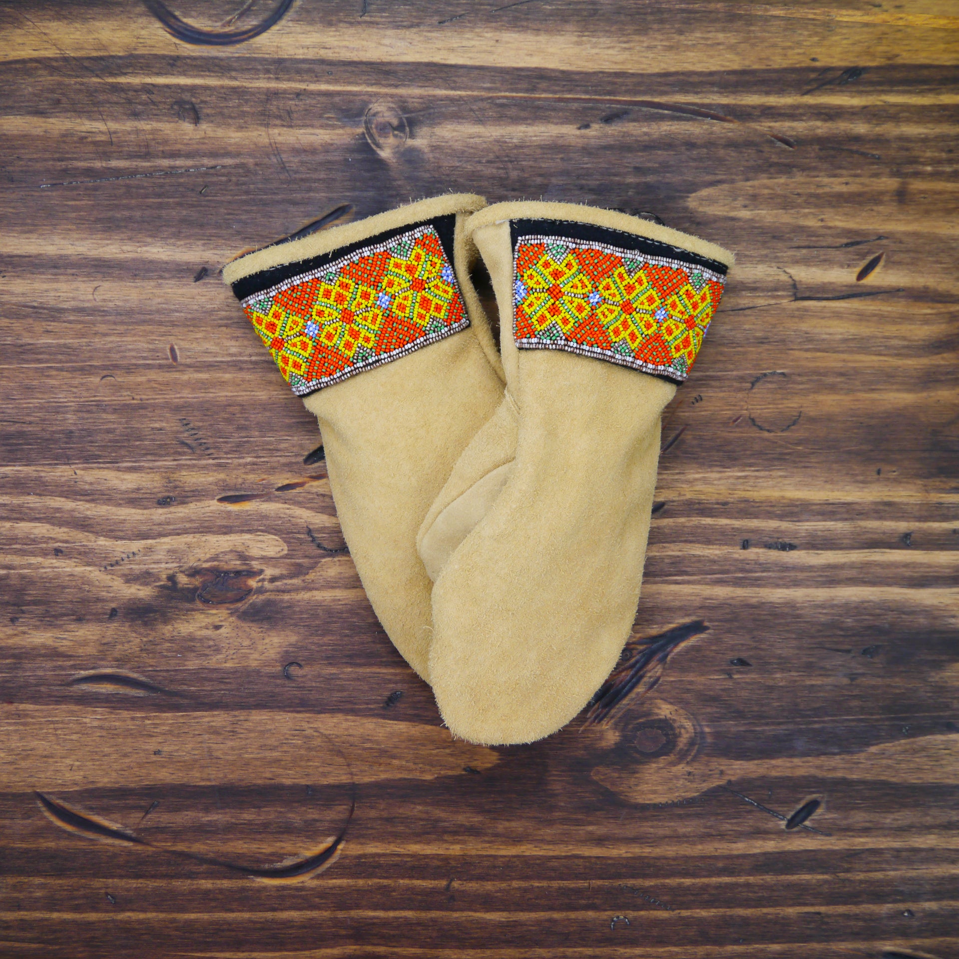As each leather mitten is hand-sewn and uses natural materials, each leather mitten will possess slight variation in the look of the leather and beadwork. Astis embraces these subtle differences and views them as unique mittens more akin to works of art.