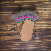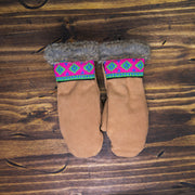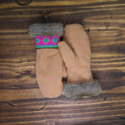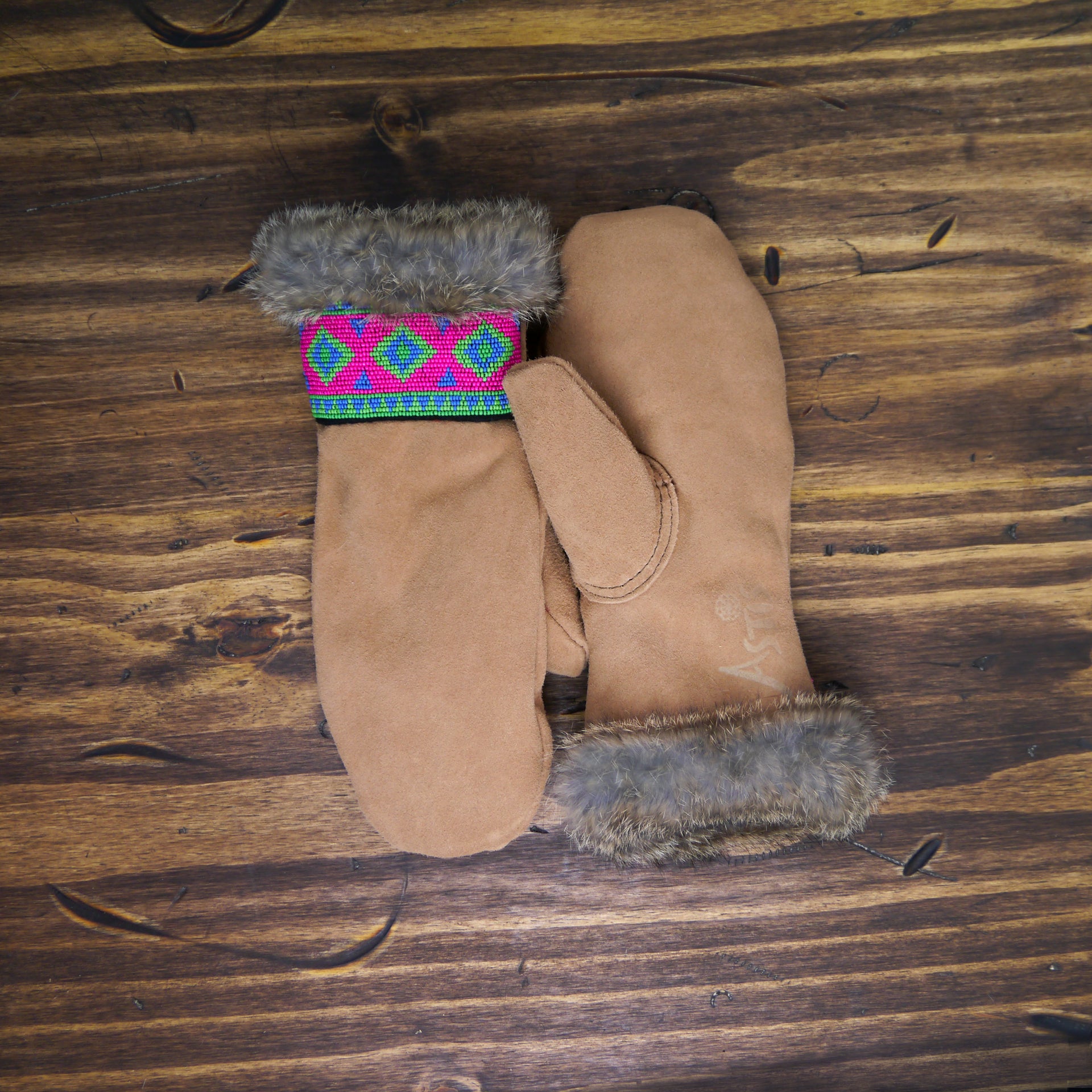 Astis leather mittens are hand-sewn in the USA from brown high-quality suede leather with hand-stitched beadwork on the wrist and are lined with Polartec® High Loft insulation. Working directly with a tannery in the USA, we developed a suede leather, injected with silicone during the tanning process for further waterproofing, that is extremely durable yet retains great dexterity.