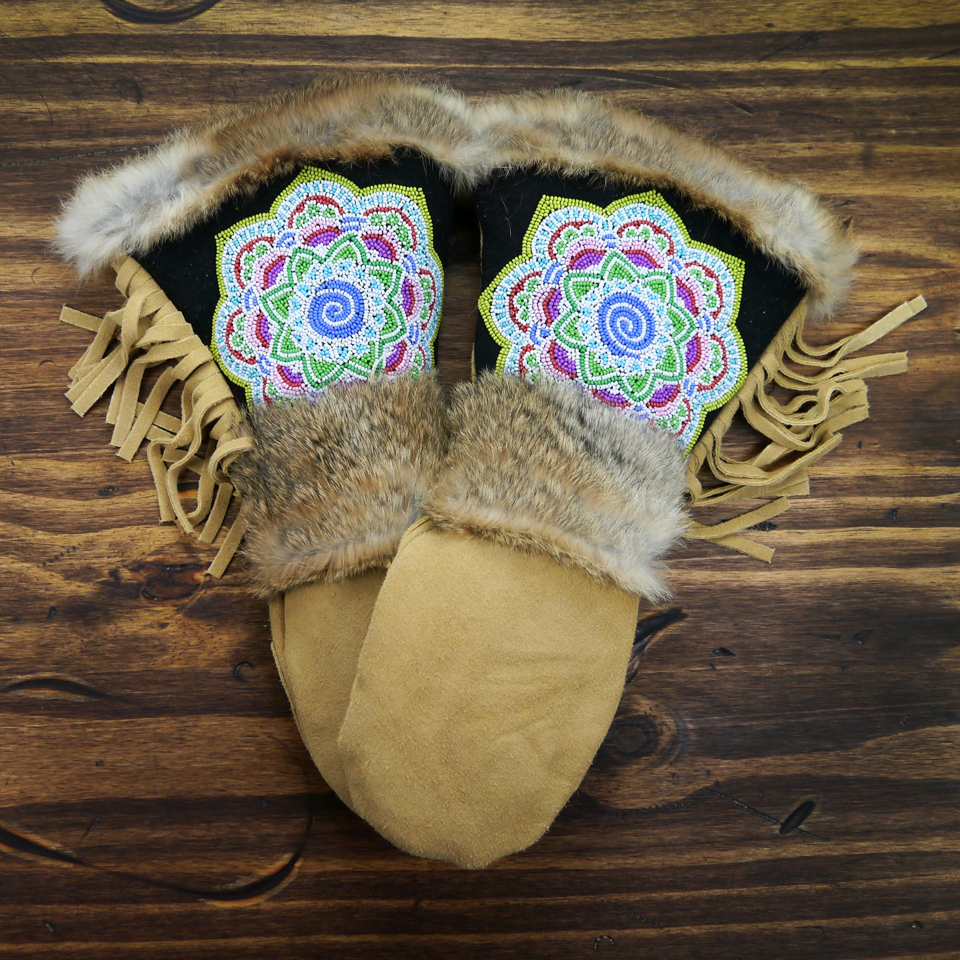 A comfortable, extremely warm mitten designed for any winter adventure, the Ojeda is not only beautiful, but designed with function in mind. The gauntlet allows for a jacket sleeve to slip inside without bunching while the fur around the cuff creates a seal to help keep the snow on the outside. The thumb and palm patches are added to provide extra protection at common wear points. The beadwork is pretty good looking as well.