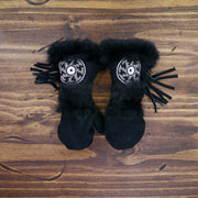 Astis leather mittens are hand-sewn in the USA from black high-quality suede leather with hand-stitched beadwork on the wrist and are lined with Polartec® High Loft insulation. Working directly with a tannery in the USA, we developed a suede leather, injected with silicone during the tanning process for further waterproofing, that is extremely durable yet retains great dexterity.