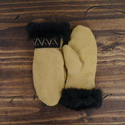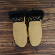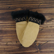 Astis leather mittens are hand-sewn in the USA from tan high-quality suede leather with hand-stitched beadwork on the wrist and are lined with Polartec® High Loft® insulation. Working directly with a tannery in the USA, we developed a suede leather, injected with silicone during the tanning process for further waterproofing, that is extremely durable yet retains great dexterity.