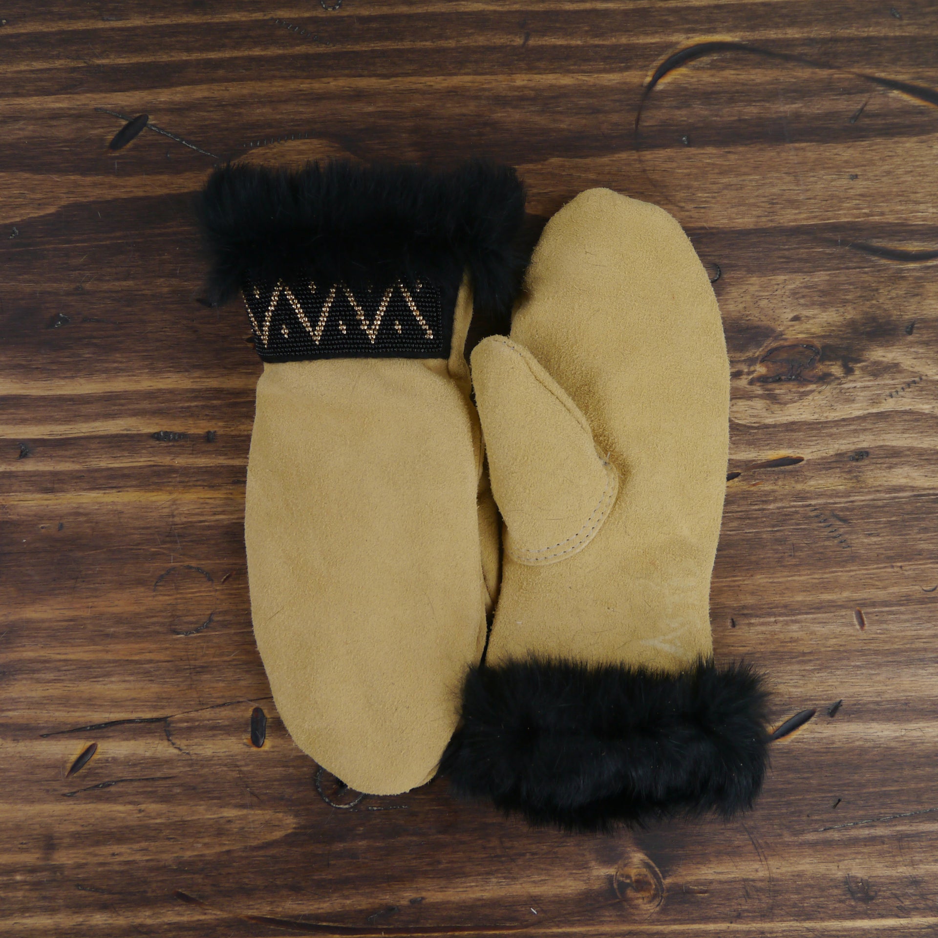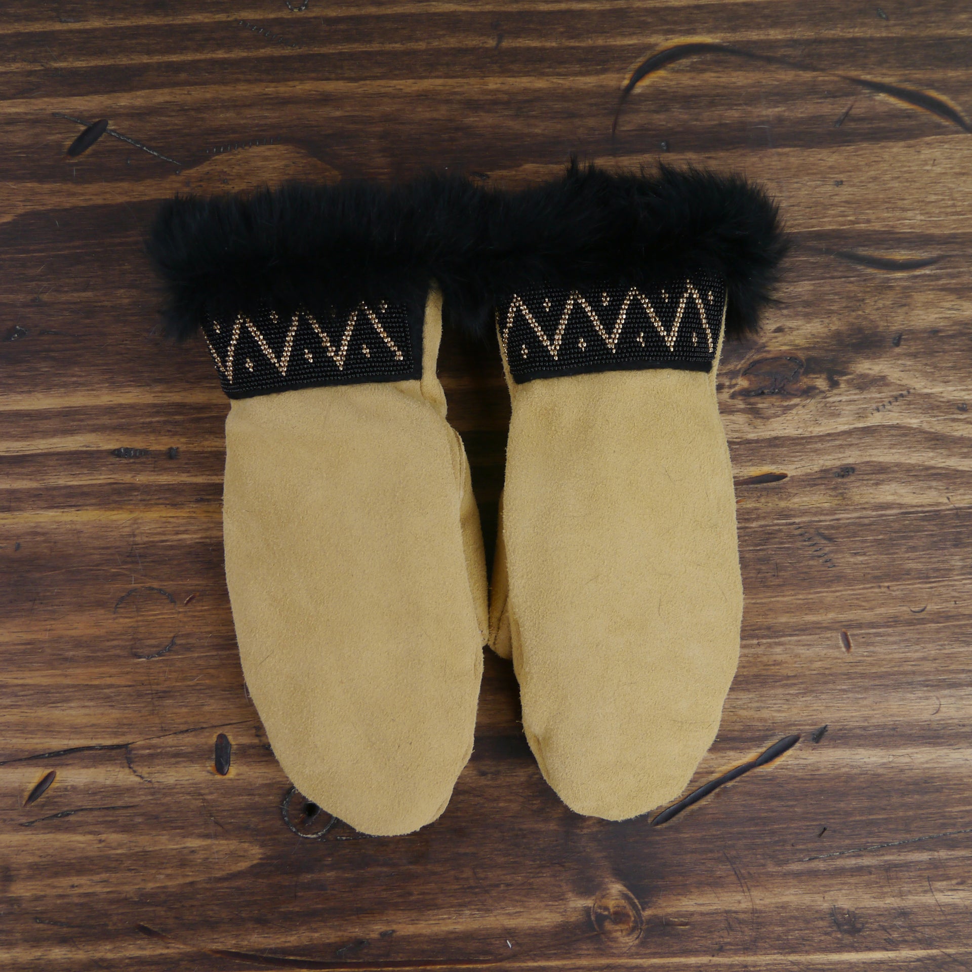 Displaying a gorgeous black and gold beadwork band across the wrist, these tan leather mittens are named for the Argentinian peak Aconcagua. Outside Asia this is the highest mountain at 22,838 feet.