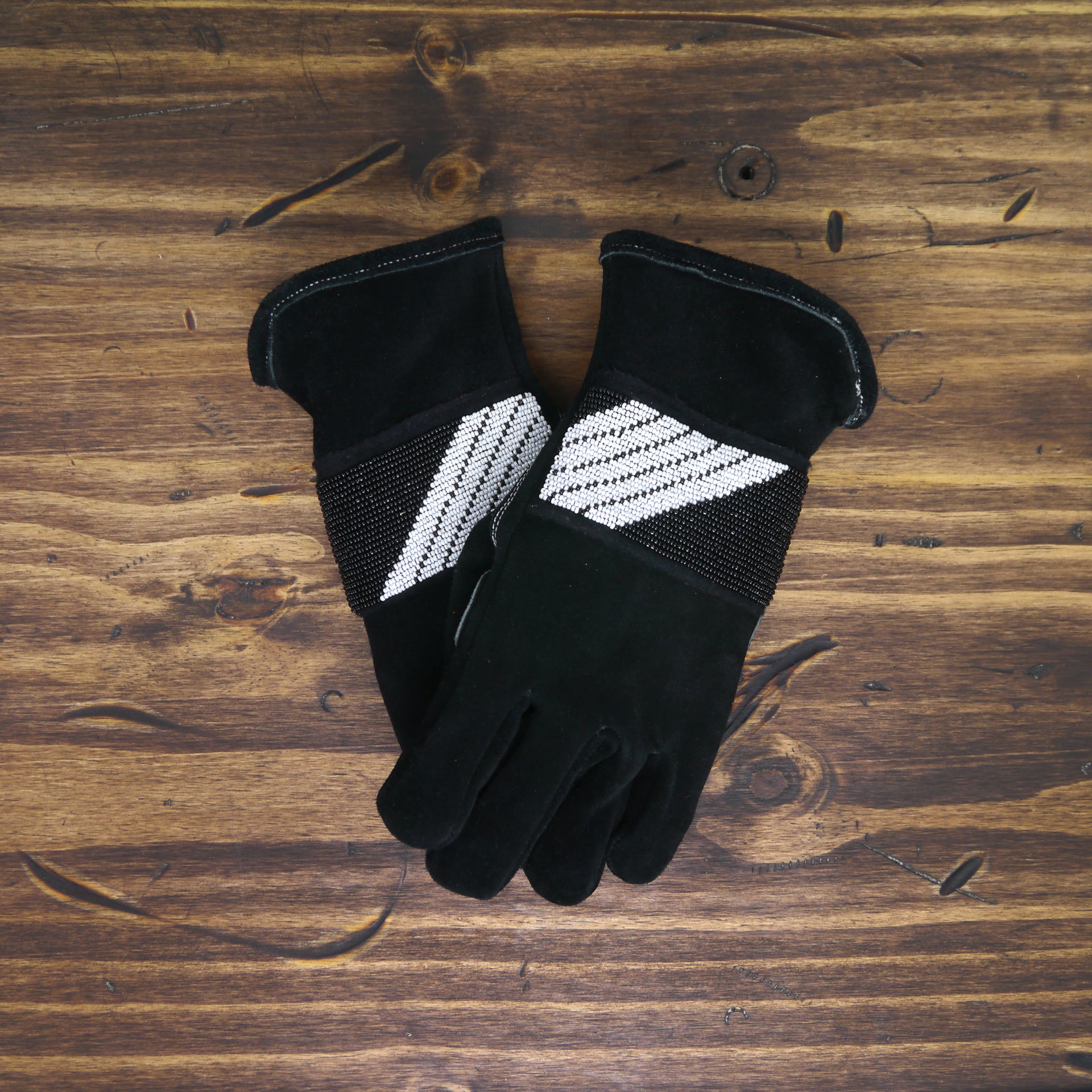 Displaying a black and white striped beadwork band across the back of the hand, these black leather gloves with white stitching are named for the Tuxer Alpens. The Tuxer Alpens are a mountain group of the central eastern Alps in Austria. The highest peak is the Lizumer Reckner.